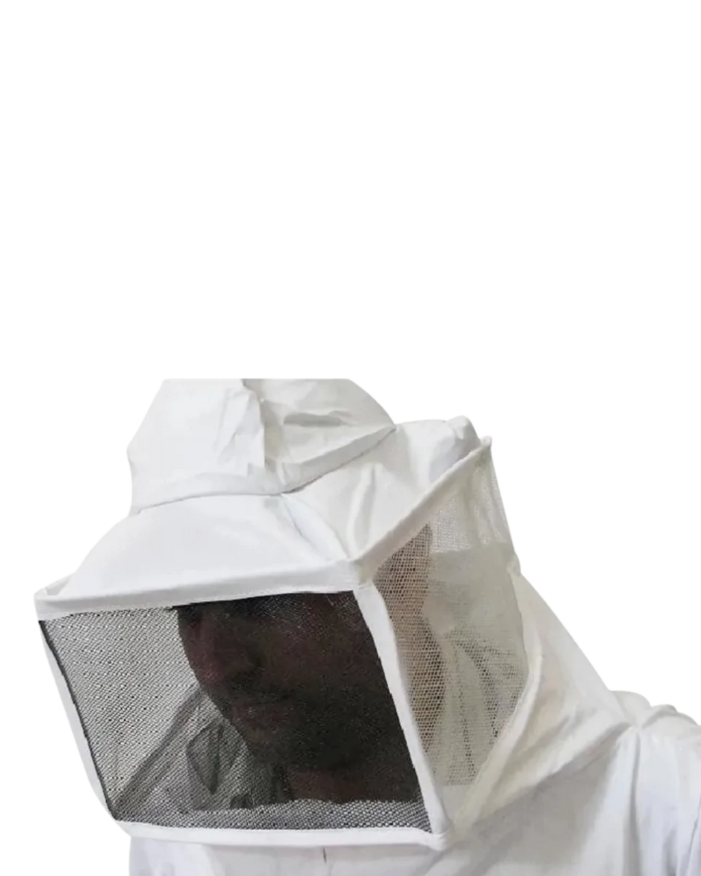 Macacão confeccionado em Brim, com tratamento anti-aderente, chapéu em PVC com tela integrada, ajuste em malha nos punhos, barra em elástico e fechamento em zíper frontal. Conta com tela de ventilação na parte frontal, dando maior conforto e respirabilidade ao usuário
